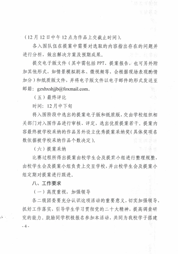 提交电子版文件(其中需包括PPT、提案报告,也可另外附加其他形式,如情景模拟剧本、微视频等,会根据现场表现酌情加分)和纸质版文件,并将电子版文件以电子邮件的形式发送至邮箱:gzxhxshjjb@foxmail.com。