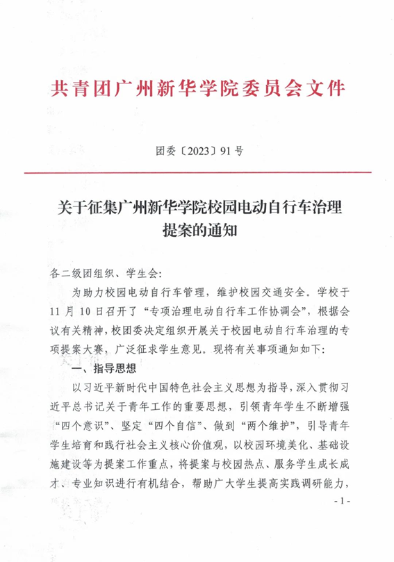 为助力校园电动自行车管理,维护校园交通安全。学校于11月10日召开了“专项治理电动自行车工作协调会”,根据会议有关精神,校团委决定组织开展关于校园电动自行车治理的专项提案大赛,广泛征求学生意见。现将有关事项通知如下: