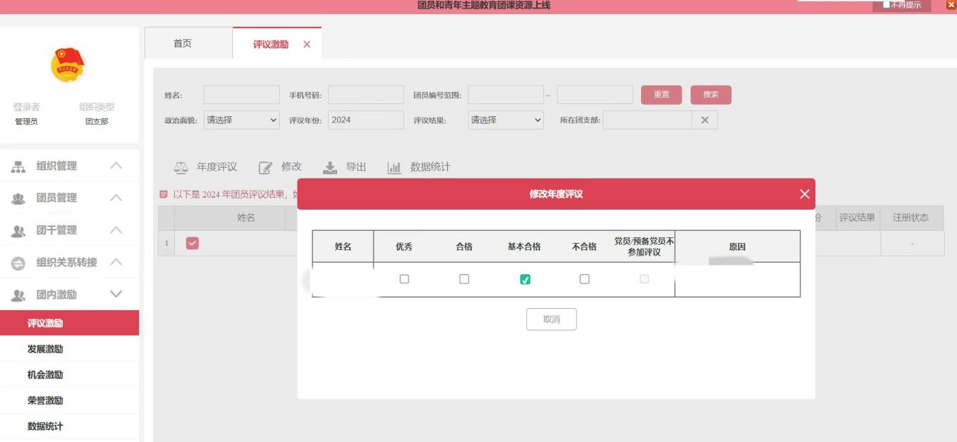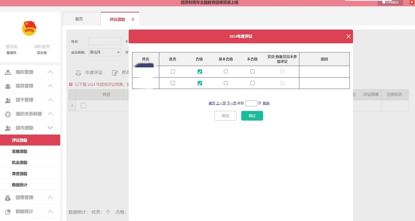 (1)点击“年度评议”,对支部团员进行评议,需一次性对本支部全部团员进行评议。