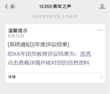 (1)收到12355青年之声公众号团员评议结果通知的推送消息,点击进入年度注册;