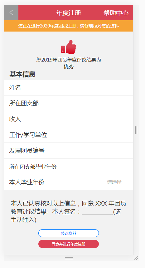 (2)确认评议结果,同时需确认以下信息:发展团员编号17年后必填;收入为非学生的,必填毕业年份;如果是非学校领域团组织,收入不允许填学生;不符合要求的需修改资料,资料修改审核完再进行步骤;