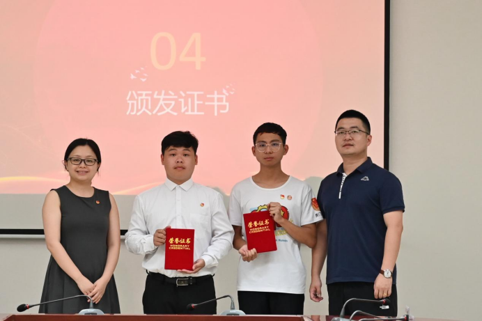 提问环节结束后,由代亮书记和陈忱老师为刘海亮和罗智勇颁发证书,并合影留念。