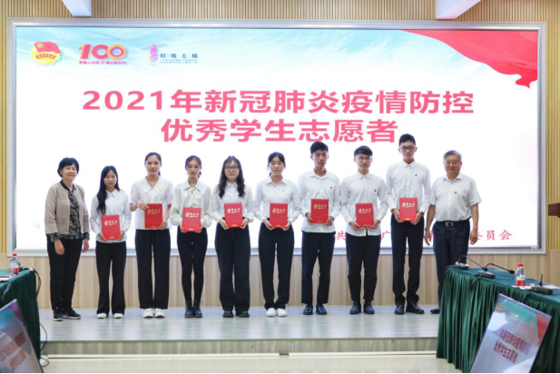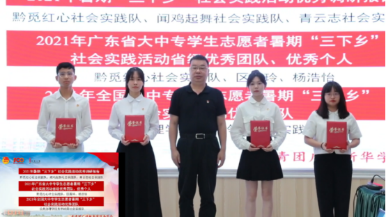 图九:胡卓加副校长为“2021年暑期‘三下乡’社会实践活动优秀调研报告”“2021年广东省大中专学生志愿者暑期‘三下乡’社会实践活动省级优秀团队、优秀个人”“2021年全国大中专学生志愿者暑期‘三下乡’社会实践活动优秀团队”获奖代表颁奖