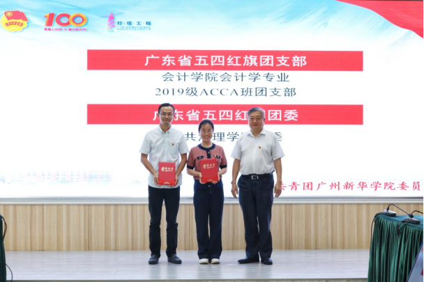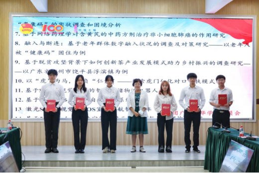 图八:党委办公室主任丁艮平同志为“2021年广东高校‘活力在基层’主题团日竞赛活动‘百优’‘千入围’项目”“第十六届‘挑战杯’广东大学生课外学术科技作品竞赛”获奖代表颁奖