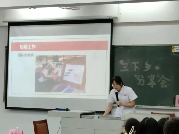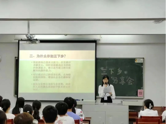 在主持人钟瑶琪的讲话中,“三下乡”经验分享会拉开序幕。主讲人邱若然从什么是“三下乡”、为什么要参加“三下乡”、“三下乡”流程与须知几个方面展开宣讲。
