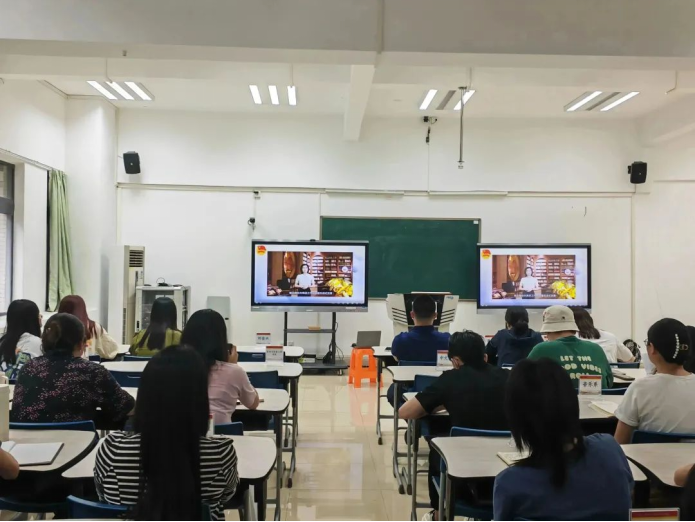 图1-图2:参会人员认真观看直播现场照(东莞校区)