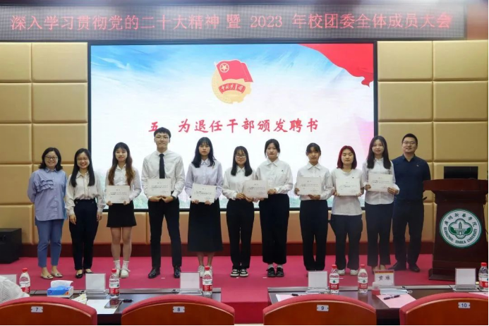 随后,校团委书记代亮同志和校团委副书记黄琳同志、校团委副书记陈忱同志为退任干部代表颁发聘书并合影留念。