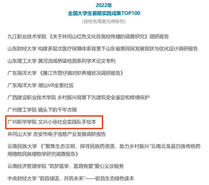 为积极响应国家号召,促进农村文化建设,大力推进农村精神文明建设,满足广大农民的精神文化生活需求,文兴小岛社会实践队在队长关舒慧、副队长黄于洋的带领下,集结了11名分别来自于资源与城乡规划学院与护理学院的队员员。队伍在宋云老师的指导下,积极参加暑期三下乡活动,其中所作成果文兴小岛社会实践队手绘本在本次全国大学生暑期实践展示活动中凭借别出心裁的创意与内涵,以及精心生动的图画,荣获全国大学生暑期实践成果TOP100。