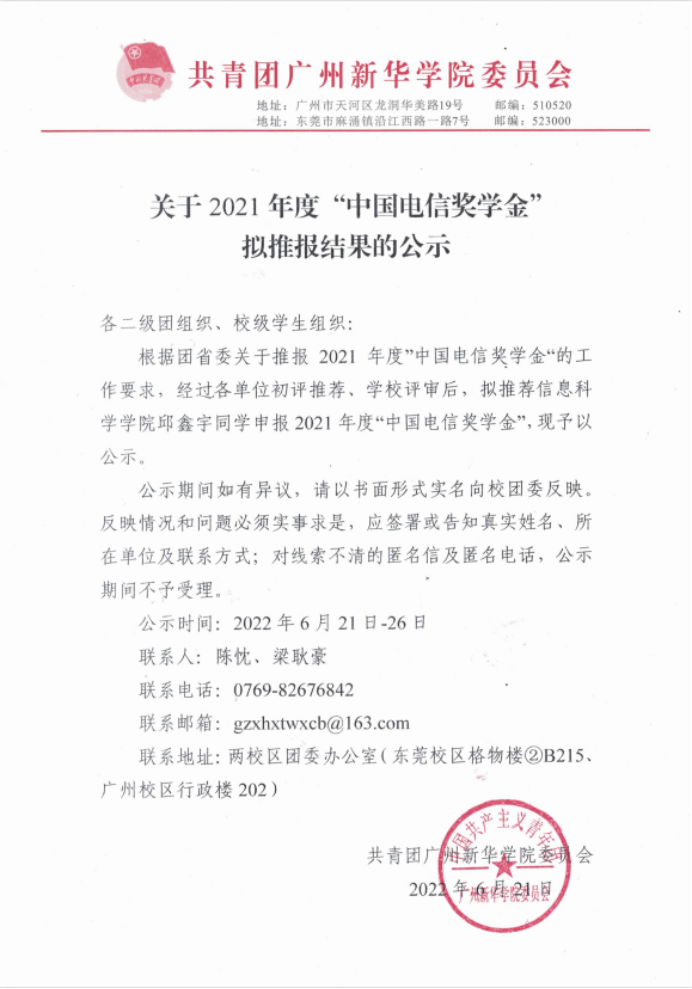 根据团省委关于推报2021年度“中国电信奖学金”的工作要求,经过各单位初评推荐、学校评审后,拟推荐信息科学学院邱鑫宇同学申报2021年度“中国电信奖学金”,现予以公示。