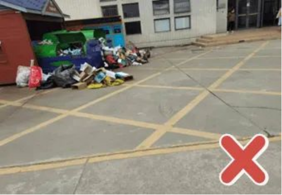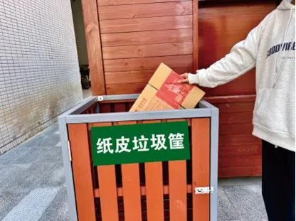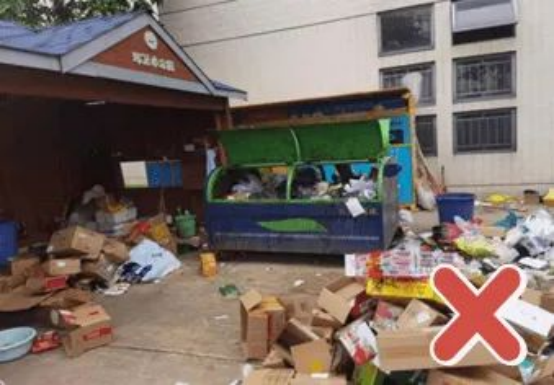 请您在垃圾分类屋前拆剪快递包装,尽量不要将快递包装带回宿舍拆剪,截断宿舍楼前垃圾小屋不堪重负的纸皮、泡沫等垃圾来源。