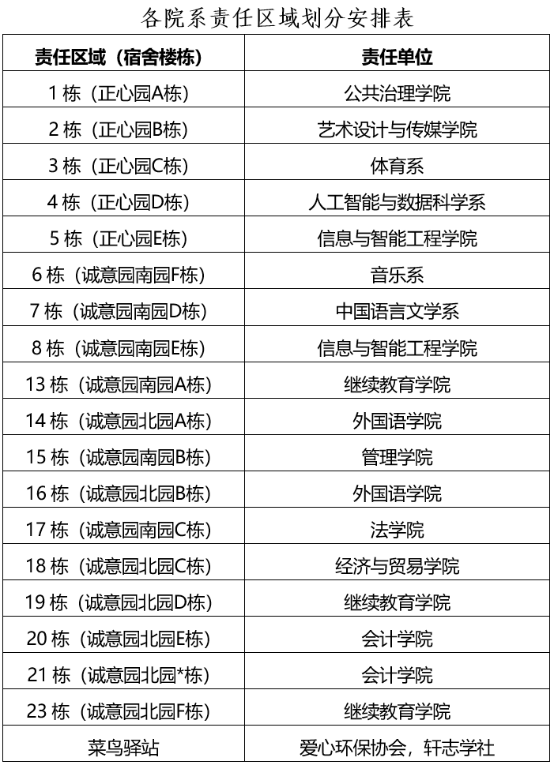 5.垃圾定时投放时间,在活动开展的第一个星期,每栋学生宿舍楼由责任院系负责安排志愿者配合保洁员引导督促垃圾分类;一个星期后,由保洁员引导督促。垃圾误时投放时间,每栋学生宿舍楼由责任院系负责在每个时段内分别派志愿者引导督促垃圾分类,持续整个活动月,志愿者须统一着装。按照全员参与行动要求,各院系的责任区域划分一般为该单位学生入住人数最多的楼栋。