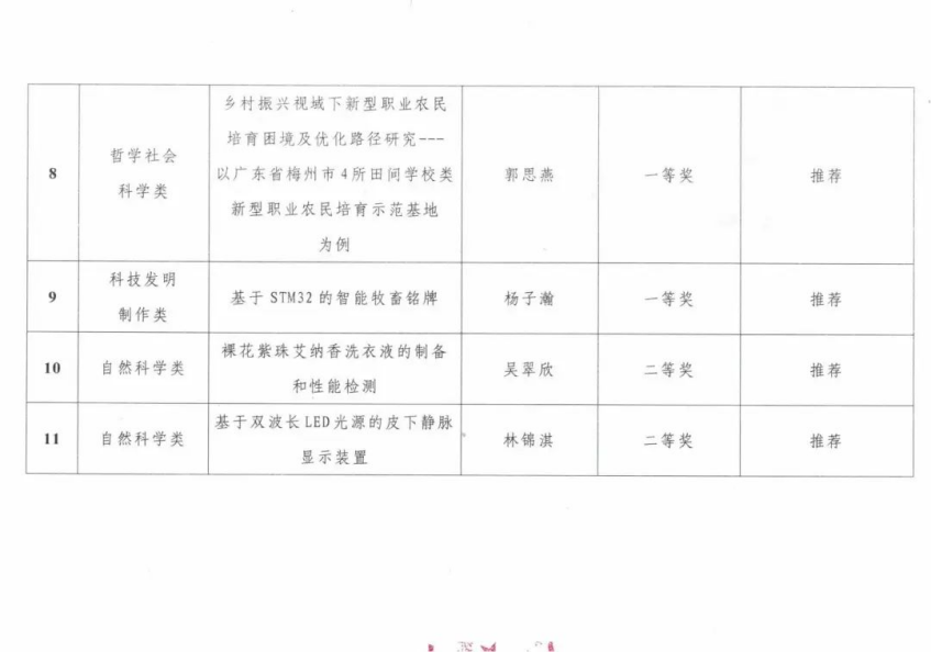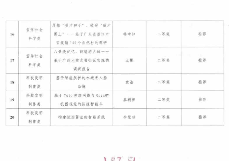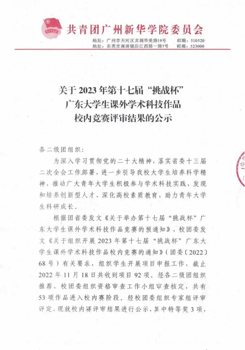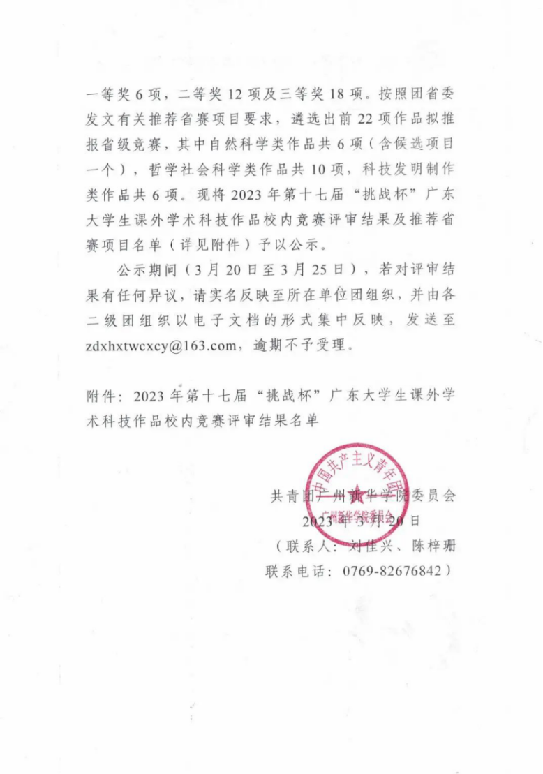 根据团省委发文《关于举办第十七届“挑战杯”广东大学生课外学术科技作品竞赛的预通知》、校团委发文《关于组织开展2023年第十七届“挑战杯”广东大学生课外学术科技作品校内竞赛的通知》(团委〔2022〕68号)有关要求,组织学生开展项目申报工作,截止2022年11月18日共收到项目92项。经各二级团组织推荐、校团委组织资格审查工作小组审查核定,共有53项作品进入校内赛阶段。经校团委组织专家组评审评定,现就校内赛评审结果进行公示,其中特等奖3项,一等奖6项,二等奖12项及三等奖18项。按照团省委发文有关推荐省赛项目要求,遴选出前22项作品拟推报省级竞赛,其中自然科学类作品共6项(含候选项目一个),哲学社会科学类作品共10项,科技发明制作类作品共6项。现将2023年第十七届“挑战杯”广东大学生课外学术科技作品校内竞赛评审结果及推荐省赛项目名单(详见附件)予以公示。