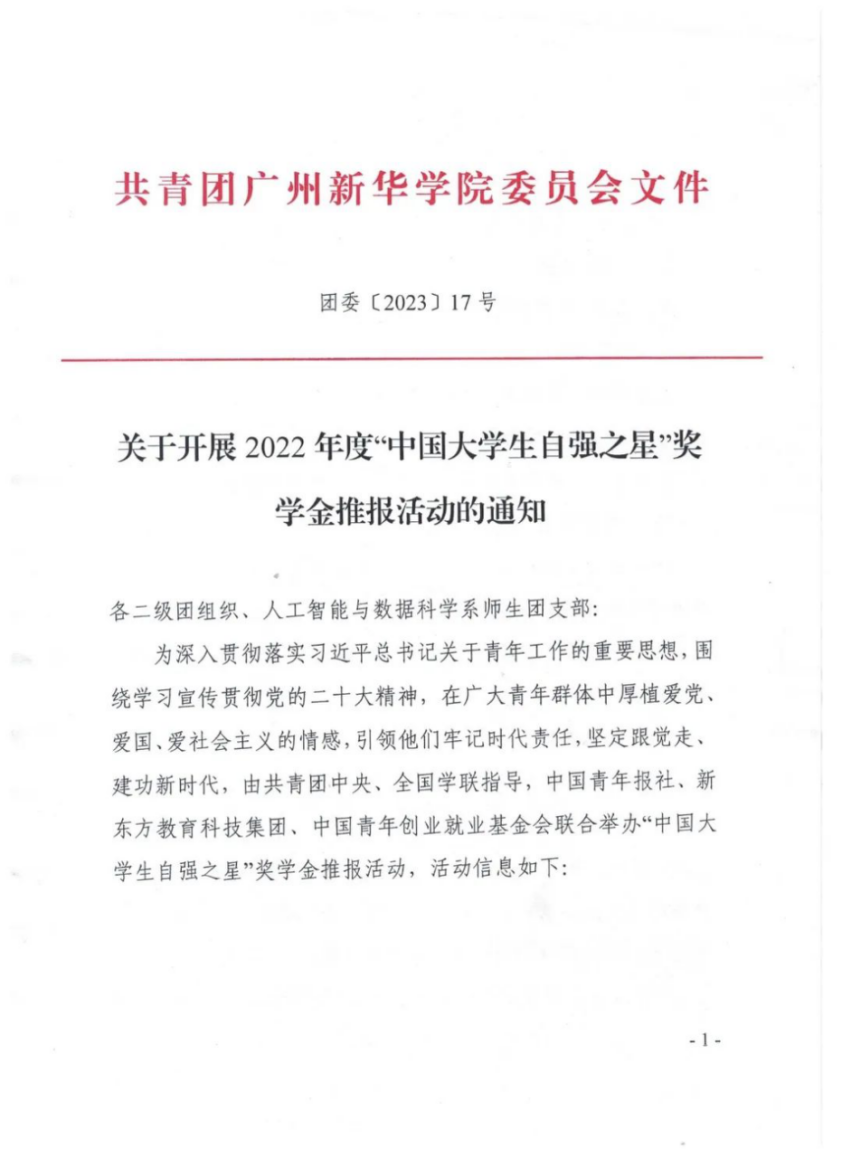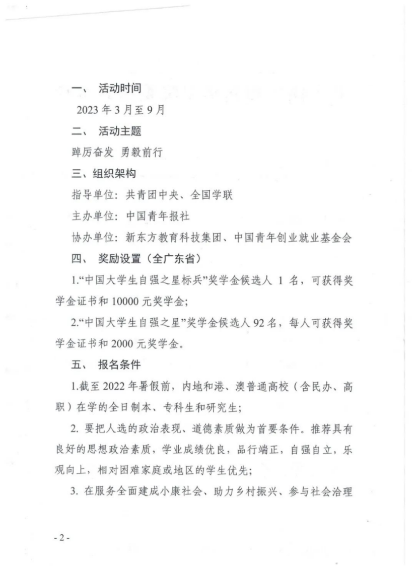 为深入贯彻落实习近平总书记关于青年工作的重要思想,围绕学习宣传贯彻党的二十大精神,在广大青年群体中厚植爱党、爱国、爱社会主义的情感,引领他们牢记时代责任,坚定跟觉走、建功新时代,由共青团中央、全国学联指导,中国青年报社、新东方教育科技集团、中国青年创业就业基金会联合举办“中国大学生自强之星”奖学金推报活动,活动信息如下: