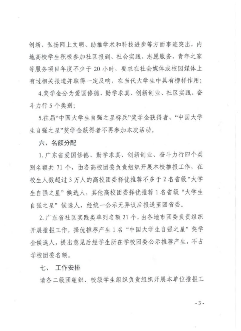 2.广东省社区实践类单列名额21个,由各地市团委负责组织开展推报工作,择优推荐产生1名“中国大学生自强之星”奖学金候选人,提出意见后经学生所在学校团委公示推荐产生,不占学校团委名额。