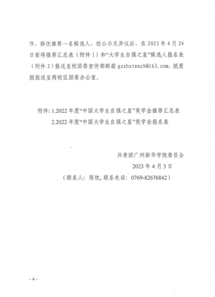请各二级团组织、校级学生组织负责组织开展本单位推报工作,择优推荐一名候选人,经公示无异议后,在2023年4月24日前将推荐汇总表(附件1)和“大学生自强之星”候选人报名表(附件2)报送至校团委宣传部邮箱gzxhxtwxcb@163.com,纸质版报送至两校区团委办公室。