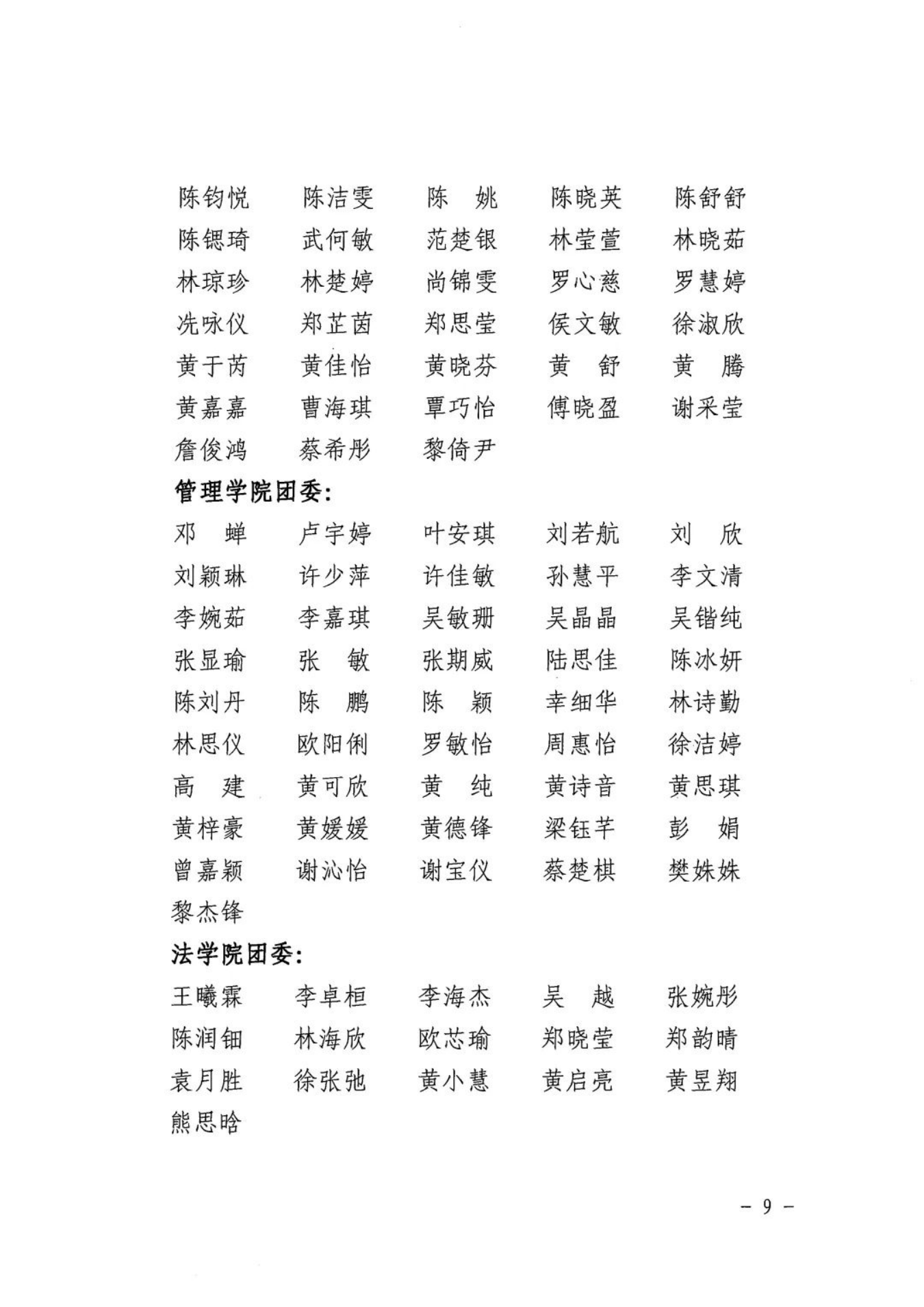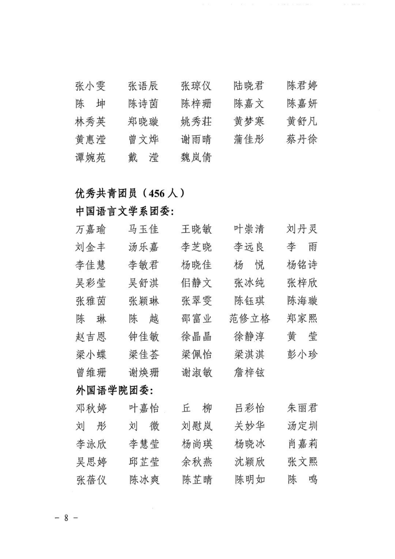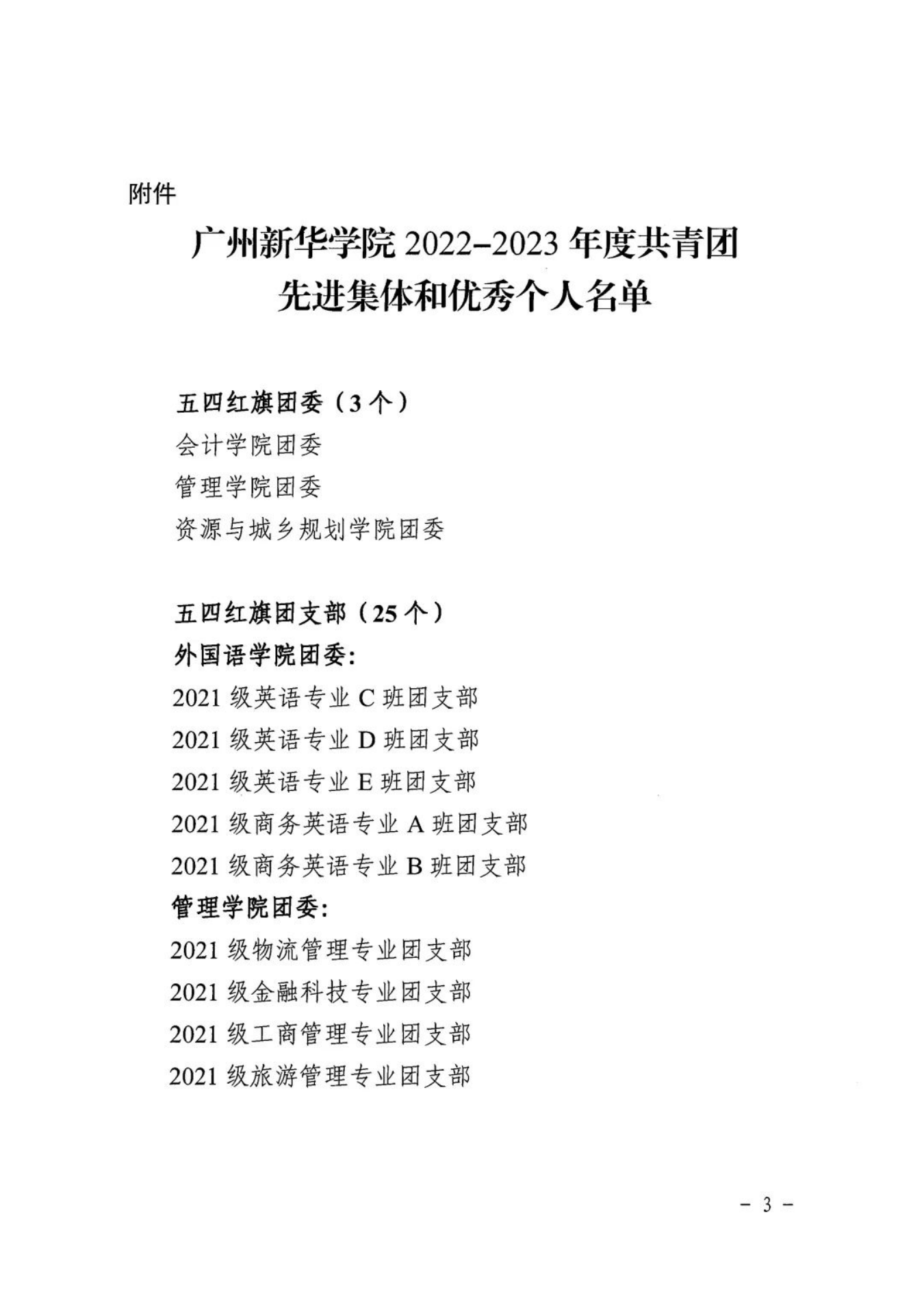 为表彰先进、树立典型、引导和激励全校各级团组织、广大团干部和团员青年奋发进取、再创佳绩,现决定授予会计学院团委等3个二级团委“五四红旗团委”荣誉称号;授予2021级英语专业C班团支部等25个团支部“五四红旗团支部”荣誉称号;授予万嘉瑜等456位同学“优秀共青团员”荣誉称号;授予江佩菁等78位同学“优秀共青团干部”荣誉称号;授予卢瑞茵等12位同学“优秀团支部书记”荣誉称号;授予蔡月明等5位同志“优秀专(兼)职团干部”荣誉称号。